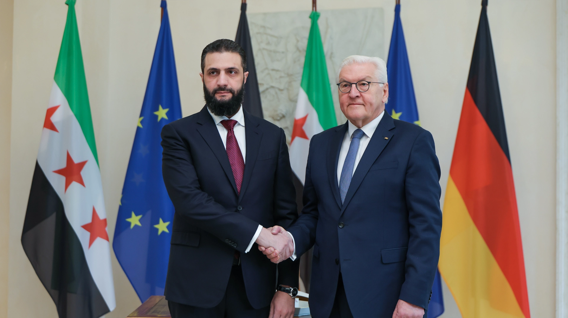 Suriye Cumhurbaşkanı Ahmed Şara, Berlin temasları kapsamında Almanya Cumhurbaşkanı Frank-Walter Steinmeier ile Cumhurbaşkanlığı Sarayı Bellevue'de bir araya geldi. Şara ve Steinmeier, önce baş başa, ardından heyetler arası görüşmelere geçti.