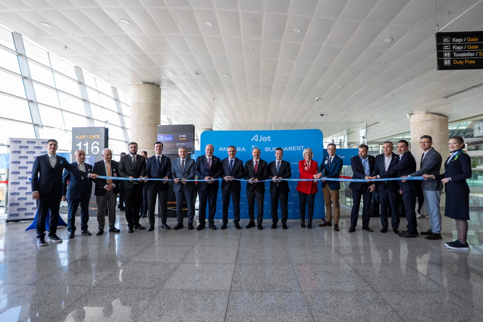 İlk tören Ankara Esenboğa Havalimanı’nda gerçekleştirildi. Havalimanında düzenlenen kurdele kesiminin ardından Türkiye Cumhuriyeti Bükreş Büyükelçisi Özgür Kıvanç Altan, AJet Genel Müdürü Kerem Sarp, Gürsel Baran ile AJet ve havalimanı üst yönetimi uçağa bindi. Boeing 737-8 MAX tipi uçakla gerçekleştirilen VF595 sefer sayılı uçak, ilk uçuşu için hazırlıklarını tamamladı. Uçuş öncesinde yolculara lokum ikram edildi. AJet Genel Müdürü Kerem Sarp da uçakta yolcularla sohbet etti. Yolculara ilk uçuşa özel hatıra hediyeler takdim edildi. Programın ikinci ayağı Romanya’da devam etti. Yaklaşık 1,5 saat süren uçuşun ardından uçak, Henri Coanda Uluslararası Havalimanı’na yolcuların alkışları eşliğinde iniş yaptı. Uçak, havalimanında havacılık geleneği olan su takı ile karşılandı. Burada basın toplantısı ve karşılama töreni düzenlendi. Törende aynı heyet yer aldı.