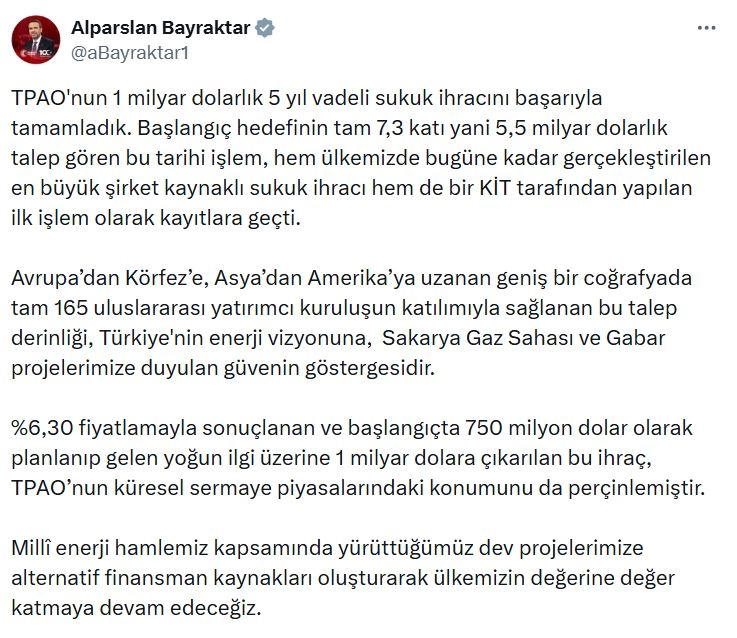 Bakan Bayraktar, sanal medya hesabından yaptığı açıklamada, "TPAO'nun 1 milyar dolarlık 5 yıl vadeli sukuk ihracını başarıyla tamamladık. Başlangıç hedefinin tam 7,3 katı yani 5,5 milyar dolarlık talep gören bu tarihi işlem, hem ülkemizde bugüne kadar gerçekleştirilen en büyük şirket kaynaklı sukuk ihracı hem de bir KİT tarafından yapılan ilk işlem olarak kayıtlara geçti. Avrupa'dan Körfez'e, Asya'dan Amerika'ya uzanan geniş bir coğrafyada tam 165 uluslararası yatırımcı kuruluşun katılımıyla sağlanan bu talep derinliği, Türkiye'nin enerji vizyonuna, Sakarya Gaz Sahası ve Gabar projelerimize duyulan güvenin göstergesidir. Yüzde 6,30 fiyatlamayla sonuçlanan ve başlangıçta 750 milyon dolar olarak planlanıp gelen yoğun ilgi üzerine 1 milyar dolara çıkarılan bu ihraç, TPAO'nun küresel sermaye piyasalarındaki konumunu da perçinlemiştir. Milli enerji hamlemiz kapsamında yürüttüğümüz dev projelerimize alternatif finansman kaynakları oluşturarak ülkemizin değerine değer katmaya devam edeceğiz" dedi. (DHA)
