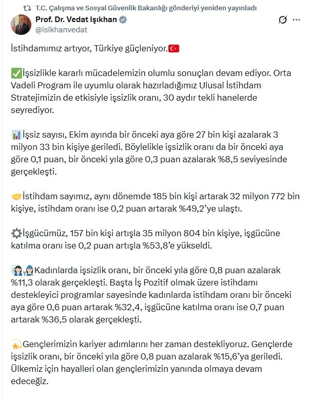 Çalışma ve Sosyal Güvenlik Bakanı Vedat Işıkhan, ekim ayı iş gücü istatistiklerine ilişkin sosyal medya hesabından açıklama yaptı. Bakan Işıkhan, "İstihdamımız artıyor, Türkiye güçleniyor. İşsizlikle kararlı mücadelemizin olumlu sonuçları devam ediyor. Orta Vadeli Program ile uyumlu olarak hazırladığımız Ulusal İstihdam Stratejimizin de etkisiyle işsizlik oranı, 30 aydır tekli hanelerde seyrediyor. İşsiz sayısı, ekim ayında bir önceki aya göre 27 bin kişi azalarak 3 milyon 33 bin kişiye geriledi. Böylelikle işsizlik oranı da bir önceki aya göre 0,1 puan, bir önceki yıla göre 0,3 puan azalarak yüzde 8,5 seviyesinde gerçekleşti. İstihdam sayımız, aynı dönemde 185 bin kişi artarak 32 milyon 772 bin kişiye, istihdam oranı ise 0,2 puan artarak yüzde 49,2'ye ulaştı”dedi.