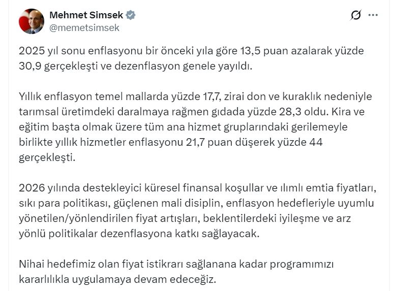 ANKARA, (DHA)- HAZİNE ve Maliye Bakanı Mehmet Şimşek, "2025 yıl sonu enflasyonu bir önceki yıla göre 13,5 puan azalarak yüzde 30,9 gerçekleşti ve dezenflasyon genele yayıldı" dedi.