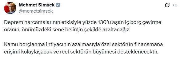 Hazine ve Maliye Bakanı Mehmet Şimşek, kamu borçları ve özel sektöre yönelik desteklere ilişkin sosyal medya hesabından açıklama yaptı. Bakan Şimşek, "Deprem harcamalarının etkisiyle yüzde 130'u aşan iç borç çevirme oranını önümüzdeki sene belirgin şekilde azaltacağız. Kamu borçlanma ihtiyacının azalmasıyla özel sektörün finansmana erişimi kolaylaşacak ve reel sektörün büyümesi desteklenecektir" ifadelerini kullandı. (DHA)