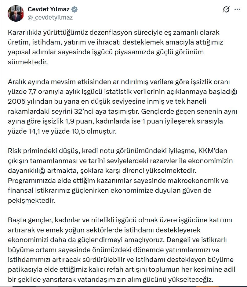 Cumhurbaşkanı Yardımcısı Cevdet Yılmaz, Türkiye İstatistik Kurumu'nun açıkladığı aralık ayı iş gücü istatistiklerine ilişkin değerlendirmede bulundu. Yılmaz, sanal medya hesabından yaptığı açıklamada, "Kararlılıkla yürüttüğümüz dezenflasyon süreciyle eş zamanlı olarak üretim, istihdam, yatırım ve ihracatı desteklemek amacıyla attığımız yapısal adımlar sayesinde iş gücü piyasamızda güçlü görünüm sürmektedir. Aralık ayında mevsim etkisinden arındırılmış verilere göre işsizlik oranı yüzde 7,7 oranıyla aylık iş gücü istatistik verilerinin açıklanmaya başladığı 2005 yılından bu yana en düşük seviyesine inmiş ve tek haneli rakamlardaki seyrini 32’nci aya taşımıştır. Gençlerde geçen senenin aynı ayına göre işsizlik 1,9 puan, kadınlarda ise 1 puan iyileşerek sırasıyla yüzde 14,1 ve yüzde 10,5 olmuştur" ifadelerini kullandı.