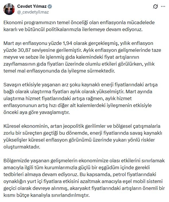 Cumhurbaşkanı Yardımcısı Cevdet Yılmaz, mart ayı enflasyon verilerine ilişkin sanal medya hesabından açıklamada, "Ekonomi programımızın temel önceliği olan enflasyonla mücadelede kararlı ve bütüncül politikalarımızla ilerlemeye devam ediyoruz. Mart ayı enflasyonu yüzde 1,94 olarak gerçekleşmiş, yıllık enflasyon yüzde 30,87 seviyesine gerilemiştir. Aylık enflasyon gelişmelerinde taze meyve ve sebze ile işlenmiş gıda kalemindeki fiyat artışlarının zayıflamasının gıda fiyatları üzerinde olumlu etkileri görülürken, yıllık temel mal enflasyonunda da iyileşme sürmektedir" ifadelerini kullandı.
