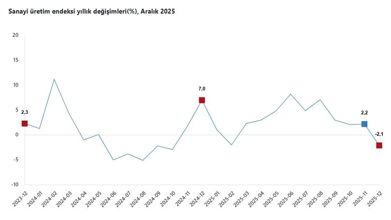 TÜİK, Aralık 2025 dönemine ilişkin sanayi üretim endeksi verilerini açıkladı. Buna göre; aralık ayında sanayi üretimi bir önceki yılın aynı ayına göre yüzde 2,1 azaldı. Sanayinin alt sektörleri incelendiğinde, 2025 yılı Aralık ayında madencilik ve taş ocakçılığı sektörü endeksi bir önceki yılın aynı ayına göre yüzde 1,9 arttı, imalat sanayi sektörü endeksi yüzde 2,7 azaldı ve elektrik, gaz, buhar ve iklimlendirme üretimi ve dağıtımı sektörü endeksi yüzde 2,4 arttı. Sanayi üretimi bir önceki aya göre yüzde 1,2 arttı. Sanayinin alt sektörleri incelendiğinde, 2025 yılı Aralık ayında madencilik ve taş ocakçılığı sektörü endeksi bir önceki aya göre yüzde 1,3 arttı, imalat sanayi sektörü endeksi yüzde 1 arttı ve elektrik, gaz, buhar ve iklimlendirme üretimi ve dağıtımı sektörü endeksi yüzde 4,1 arttı. (DHA)
