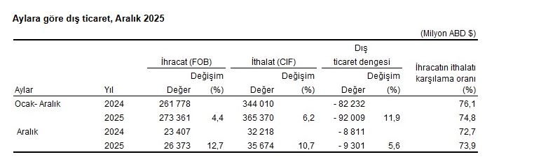 TÜİK, Aralık 2025 dönemine ilişkin dış ticaret istatistiklerini açıkladı. Buna göre; ihracat 2025 yılı Aralık ayında, bir önceki yılın aynı ayına göre yüzde 12,7 artarak 26 milyar 373 milyon dolar, ithalat yüzde 10,7 artarak 35 milyar 674 milyon dolar olarak gerçekleşti. İhracat 2025 yılı Ocak-Aralık döneminde bir önceki yılın aynı dönemine göre yüzde 4,4 artarak 273 milyar 361 milyon dolar, ithalat yüzde 6,2 artarak 365 milyar 370 milyon dolar olarak gerçekleşti.