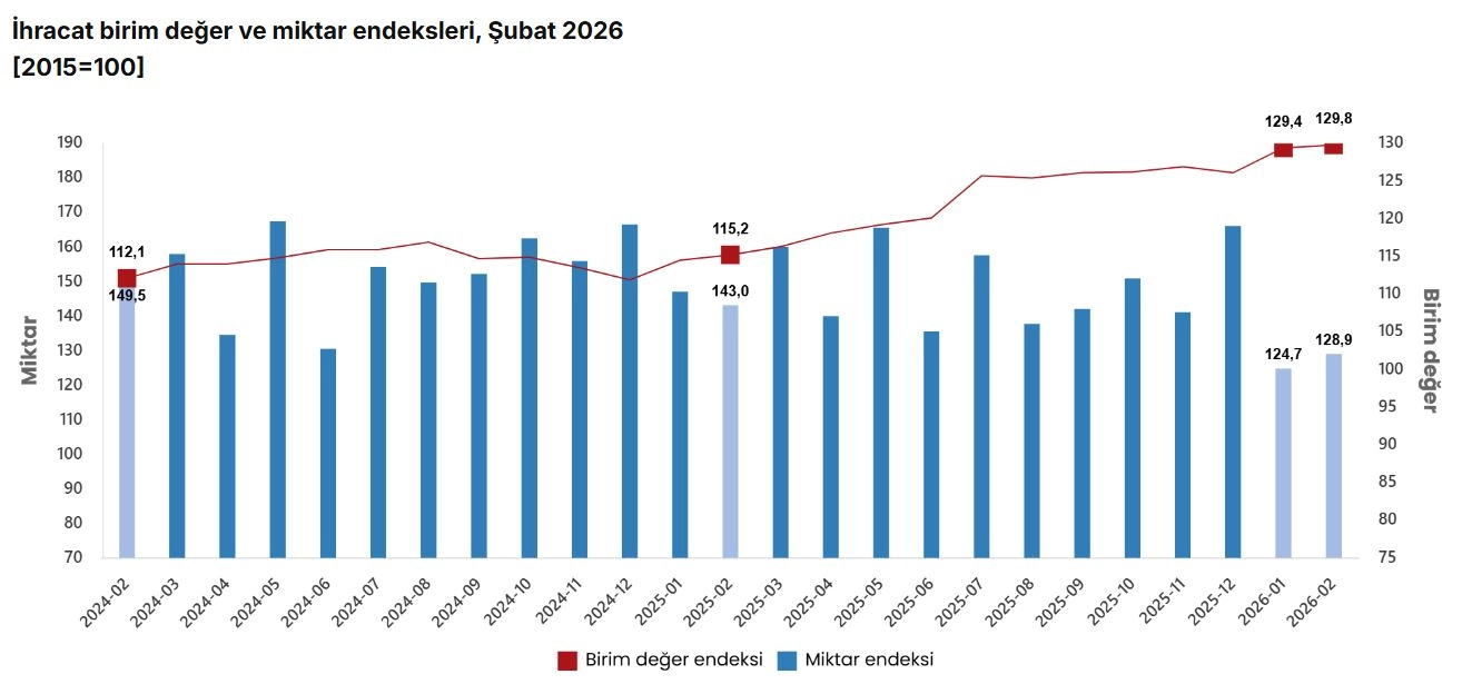 TÜİK, Şubat 2026 dönemine ilişkin dış ticaret endekslerini açıkladı. Buna göre, ihracat birim değer endeksi şubat ayında bir önceki yılın aynı ayına göre yüzde 12,7 arttı. Endeks bir önceki yılın aynı ayına göre gıda, içecek ve tütünde yüzde 12,5 arttı, ham maddelerde (yakıt hariç) yüzde 9,7 arttı, yakıtlarda yüzde 6,8 azaldı, imalat sanayinde (gıda, içecek, tütün hariç) yüzde 13,3 arttı. İhracat miktar endeksi, şubat ayında bir önceki yılın aynı ayına göre yüzde 10,1 azaldı. Endeks bir önceki yılın aynı ayına göre gıda, içecek ve tütünde yüzde 13,9 azaldı, ham maddelerde (yakıt hariç) yüzde 8,7 azaldı, yakıtlarda yüzde 35,6 azaldı, imalat sanayinde (gıda, içecek, tütün hariç) yüzde 7 azaldı.