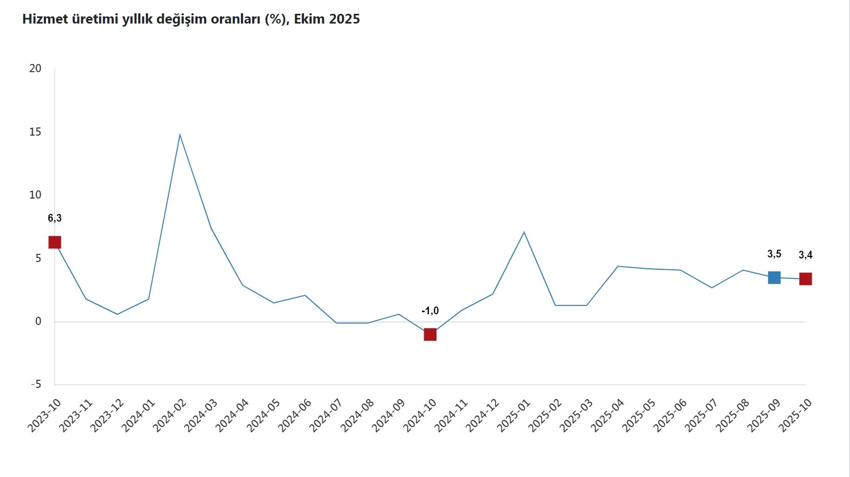 ANKARA, (DHA)- TÜRKİYE İstatistik Kurumu (TÜİK), ekim ayında hizmet üretiminin yıllık yüzde 3,4 arttığını, aylık yüzde 0,3 azaldığını açıkladı.