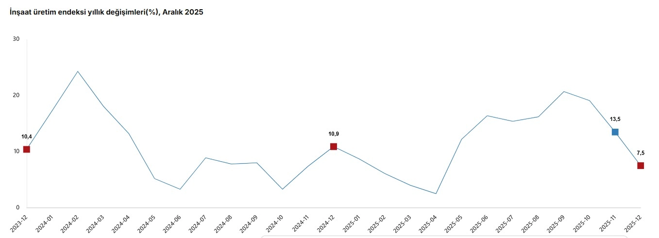 TÜİK, Aralık 2025 dönemine ilişkin inşaat üretim endeksi verilerini açıkladı. Buna göre; inşaat üretimi yıllık yüzde 7,5 arttı. İnşaatın alt sektörleri incelendiğinde, 2025 yılı Aralık ayında bina inşaatı sektörü endeksi bir önceki yılın aynı ayına göre yüzde 8,4, bina dışı yapıların inşaatı sektörü endeksi yüzde 5,8 ve özel inşaat faaliyetleri sektörü endeksi yüzde 5,5 arttı.