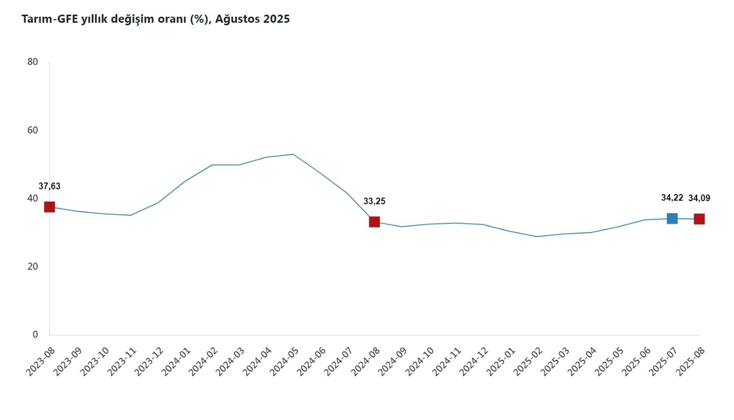 TÜİK, Ağustos 2025 dönemine ilişkin tarımsal girdi fiyat endeksi verilerini açıkladı. Buna göre; tarımsal girdi fiyatları, ağustos ayında bir önceki aya göre yüzde 1,30, bir önceki yılın aralık ayına göre yüzde 23,81, bir önceki yılın aynı ayına göre yüzde 34,09 ve 12 aylık ortalamalara göre yüzde 31,94 arttı. Ana gruplarda ise bir önceki aya göre, tarımda kullanılan mal ve hizmetler endeksinde yüzde 1,55 artış, tarımsal yatırıma katkı sağlayan mal ve hizmetler endeksinde yüzde 0,18 azalış gerçekleşti. Bir önceki yılın aynı ayına göre tarımda kullanılan mal ve hizmetler endeksinde yüzde 35,07 artış, tarımsal yatırıma katkı sağlayan mal ve hizmetler endeksinde yüzde 28,51 artış gerçekleşti. Yıllık değişimin en yüksek olduğu alt grup yüzde 59,79 artış ile veteriner harcamaları, aylık değişimin en yüksek olduğu alt grup yüzde 3,94 artış ile gübre ve toprak geliştiriciler oldu. (DHA)