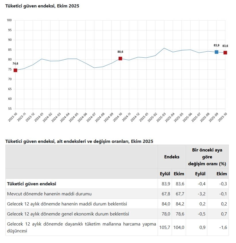 ANKARA, (DHA)- TÜRKİYE İstatistik Kurumu (TÜİK), tüketici güven endeksinin ekim ayında yüzde 0,3 oranında azalarak 83,6 olduğunu açıkladı.
