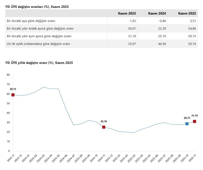 TÜİK, Kasım 2025 dönemine ilişkin yurt dışı üretici fiyat endeksi verilerini açıkladı. Buna göre; yurt dışı üretici fiyatları kasım ayında bir önceki aya göre yüzde 1,02, bir önceki yılın aralık ayına göre yüzde 30,01, bir önceki yılın aynı ayına göre yüzde 31,19 ve 12 aylık ortalamalara göre yüzde 25,67 arttı. Sanayinin iki sektörünün yıllık değişimleri; madencilik ve taş ocakçılığında yüzde 40,75 artış, imalatta yüzde 31,02 artış olarak gerçekleşti. Ana sanayi gruplarının yıllık değişimleri; ara mallarında yüzde 28,24 artış, dayanıklı tüketim mallarında yüzde 36,70 artış, dayanıksız tüketim mallarında yüzde 38,38 artış, enerjide yüzde 22 artış, sermaye mallarında yüzde 29,75 artış olarak gerçekleşti. Sanayinin iki sektörünün aylık değişimleri; madencilik ve taş ocakçılığında yüzde 2,82 artış, imalatta yüzde 0,99 artış olarak gerçekleşti. Ana sanayi gruplarının aylık değişimleri; ara mallarında yüzde 1,03 artış, dayanıklı tüketim mallarında yüzde 0,37 artış, dayanıksız tüketim mallarında yüzde 1,46 artış, enerjide yüzde 4,65 artış, sermaye mallarında yüzde 0,14 artış olarak gerçekleşti. (DHA)