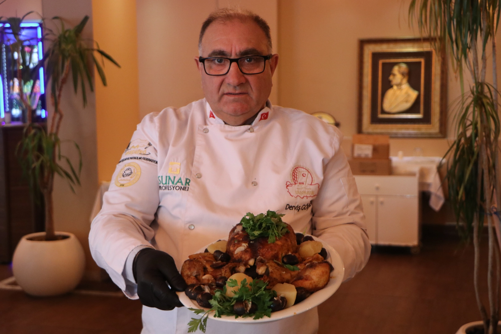 Tavuk dolmasının tarifini de paylaşan Göçmen, “Tüm tavuğu öncelikle belirli bir süre haşlıyoruz. Daha sonra sosluyoruz ve fırına sürüyoruz. Sebzelerini ayrı haşlayıp, fırından çıkardığımız kızarmış tavuk ile birleştiriyoruz. Baharatlı ve kuş üzümlü pilavımızı tabağa alıp üzerine tavuk ve sebzelerimizi ilave ediyoruz. Kestane ile de süsleyerek servise hazır hale getiriyoruz” dedi.