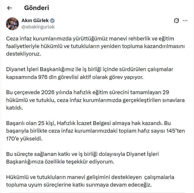 ANKARA, (DHA)- ADALET Bakanı Akın Gürlek, "2026 yılında hafızlık eğitim sürecini tamamlayan 29 hükümlü ve tutuklu, ceza infaz kurumlarımızda gerçekleştirilen sınavlara katıldı. Başarılı olan 25 kişi, Hafızlık İcazet Belgesi almaya hak kazandı. Bu başarıyla birlikte ceza infaz kurumlarımızdaki toplam hafız sayısı 145’ten 170’e yükseldi” dedi.