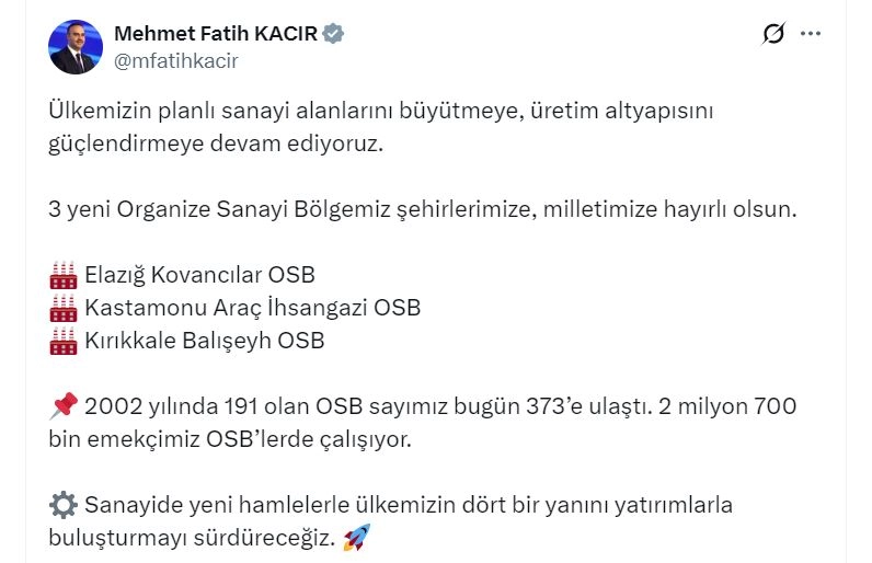 Bakan Kacır, sanal medya hesabından yapılan açıklamada, "Ülkemizin planlı sanayi alanlarını büyütmeye, üretim altyapısını güçlendirmeye devam ediyoruz. 3 yeni organize sanayi bölgemiz şehirlerimize, milletimize hayırlı olsun; Elazığ Kovancılar OSB, Kastamonu Araç İhsangazi OSB, Kırıkkale Balışeyh OSB. 2002 yılında 191 olan OSB sayımız bugün 373'e ulaştı. 2 milyon 700 bin emekçimiz OSB'lerde çalışıyor. Sanayide yeni hamlelerle ülkemizin dört bir yanını yatırımlarla buluşturmayı sürdüreceğiz" ifadelerini kullandı. (DHA)