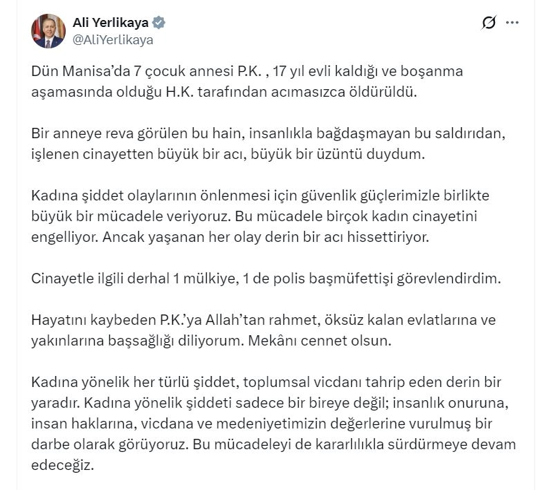 Bakan Yerlikaya, sanal medya hesabından yaptığı açıklamada, "Dün Manisa'da 7 çocuk annesi P.K., 17 yıl evli kaldığı ve boşanma aşamasında olduğu H.K. tarafından acımasızca öldürüldü. Bir anneye reva görülen bu hain, insanlıkla bağdaşmayan bu saldırıdan, işlenen cinayetten büyük bir acı, büyük bir üzüntü duydum. Kadına şiddet olaylarının önlenmesi için güvenlik güçlerimizle birlikte büyük bir mücadele veriyoruz. Bu mücadele birçok kadın cinayetini engelliyor. Ancak yaşanan her olay derin bir acı hissettiriyor" ifadelerini kullandı.
