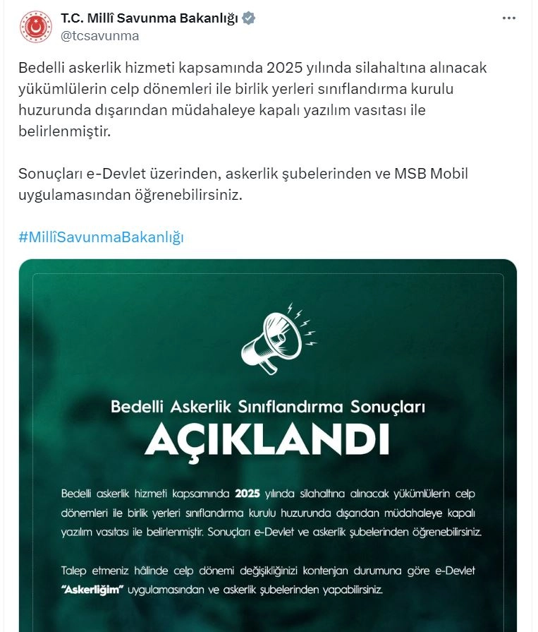 ANKARA, (DHA)- MİLLİ Savunma Bakanlığı (MSB), 2025 yılında silahaltına alınacak yükümlülerin celp dönemleri ile birlik yerlerinin belirlendiğini, sonuçların e-Devlet, askerlik şubeleri ve MSB Mobil uygulamasından öğrenilebileceğini duyurdu.Bakanlığın sosyal medya hesabından yapılan açıklamada, "Bedelli askerlik hizmeti kapsamında 2025 yılında silahaltına alınacak yükümlülerin celp dönemleri ile birlik yerleri sınıflandırma kurulu huzurunda dışarından müdahaleye kapalı yazılım vasıtası ile belirlenmiştir. Sonuçları e-Devlet üzerinden, askerlik şubelerinden ve MSB Mobil uygulamasından öğrenebilirsiniz" denildi. (DHA)