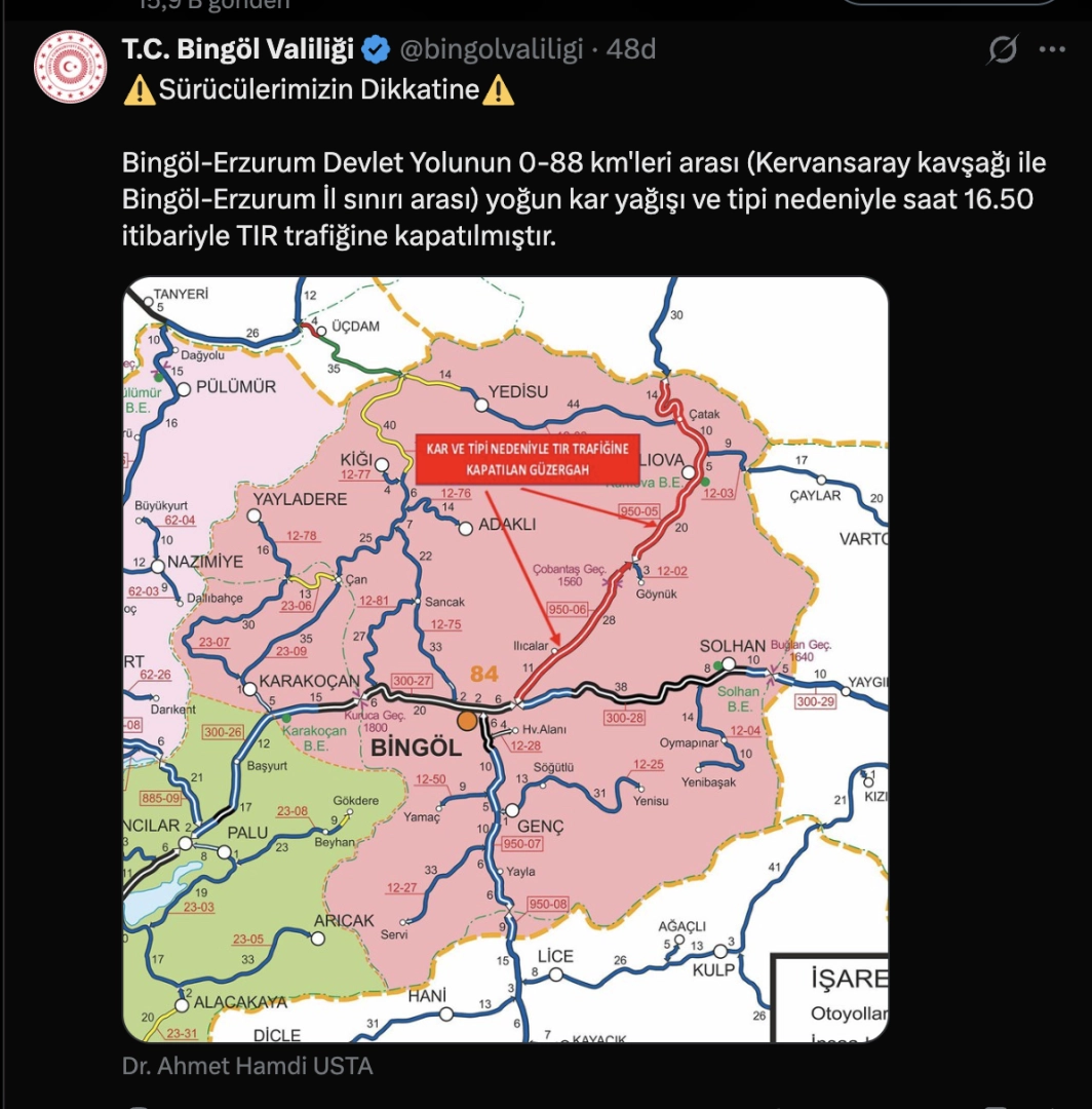 Bingöl Valiliği'nden yapılan açıklamada, Bingöl-Erzurum kara yolunun bir bölümünün TIR trafiğine kapatıldığı belirtildi. Açıklamada, "Bingöl-Erzurum Devlet Yolu'nun 0-88 kilometreleri arası (Kervansaray Kavşağı ile Bingöl-Erzurum il sınırı arası) yoğun kar yağışı ve tipi nedeniyle saat 16.50 itibariyle TIR trafiğine kapatılmıştır" ifadelerine yer verildi. (DHA)