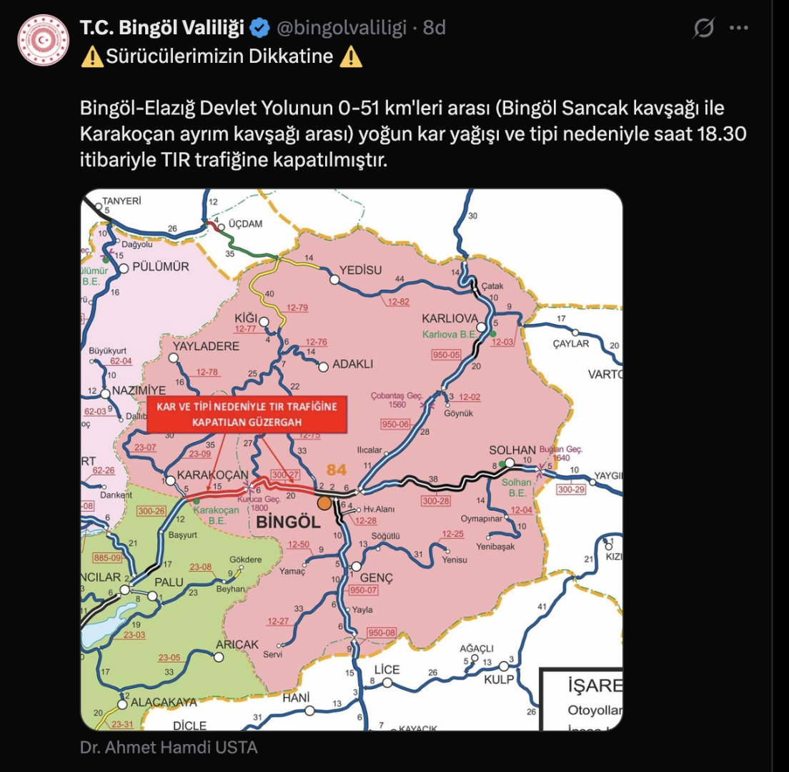 BİNGÖL-ELAZIĞ KARA YOLUNUN BİR BÖLÜMÜ TIR TRAFİĞİNE KAPATILDI