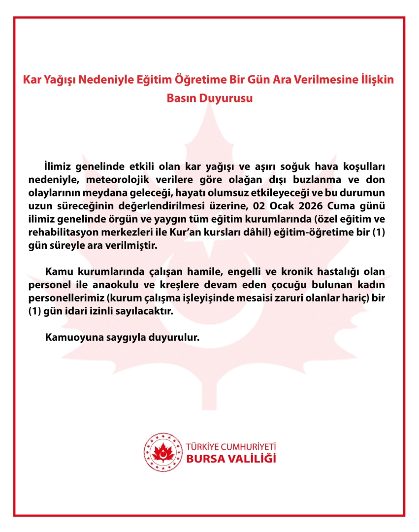 “İlimiz genelinde etkili olan kar yağışı ve aşırı soğuk hava koşulları nedeniyle, meteorolojik verilere göre olağan dışı buzlanma ve don olaylarının meydana geleceği, hayatı olumsuz etkileyeceği ve bu durumun uzun süreceğinin değerlendirilmesi üzerine, 02 Ocak 2026 Cuma günü ilimiz genelinde örgün ve yaygın tüm eğitim kurumlarında (özel eğitim ve rehabilitasyon merkezleri ile Kur'an kursları dahil) eğitim-öğretime bir (1) gün süreyle ara verilmiştir.