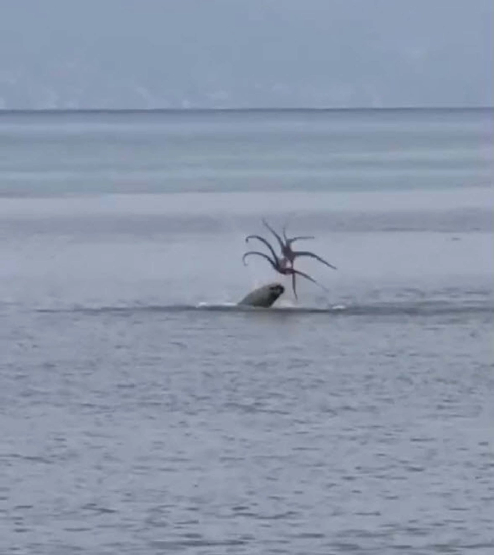 Tekin GÜRBULAK/İZMİR, (DHA)- İZMİR'in Çeşme ilçesi açıklarında bir Akdeniz foku, ahtapot avlarken görüntülendi. Nadiren karaya yakın bölgelerde görülen fok, deniz yüzeyinde avını yediği o anlar çevredekiler tarafından cep telefonuyla görüntülendi.