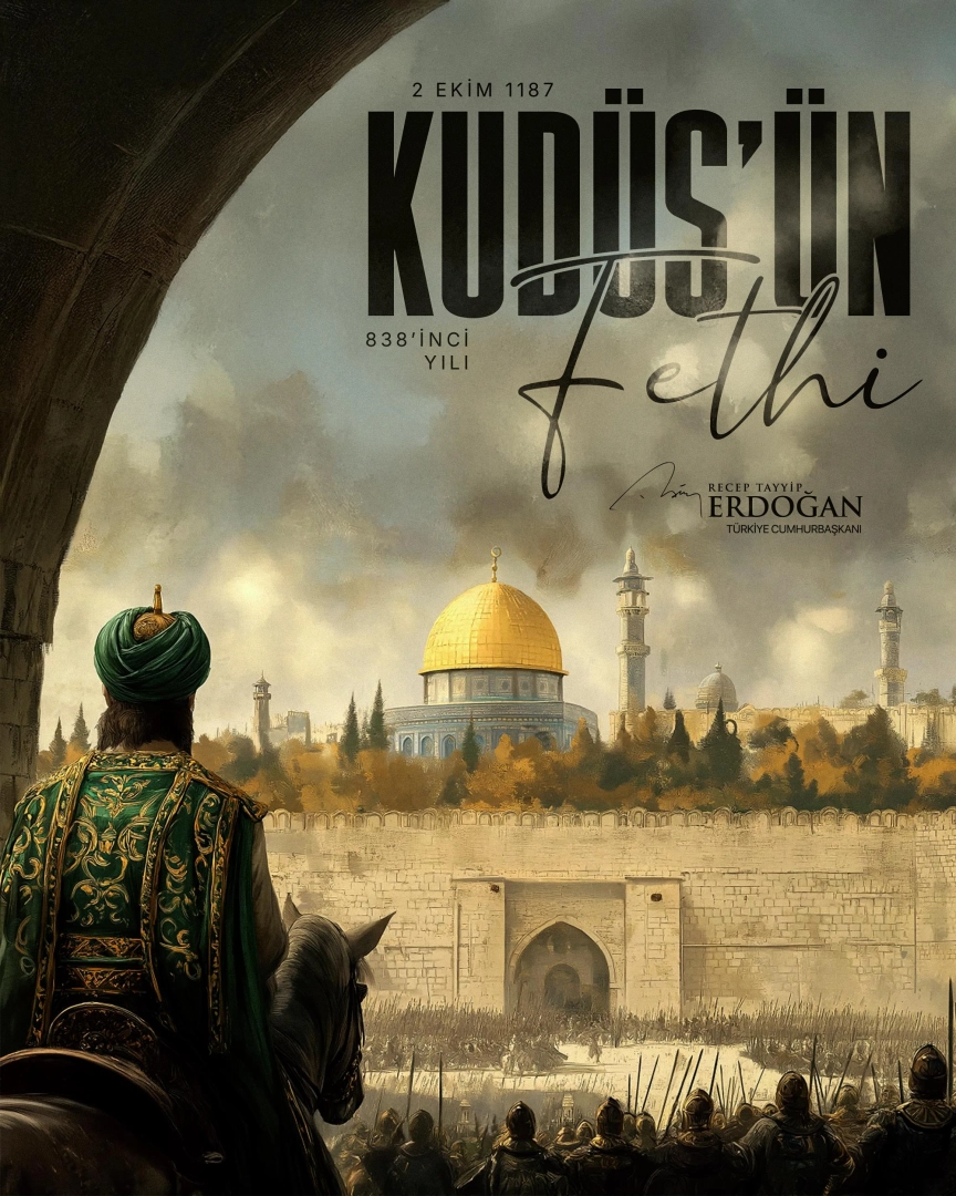 ANKARA, (DHA)- CUMHURBAŞKANI Recep Tayyip Erdoğan, Kudüs'ün Fethi'nin 838'inci yıl dönümüne ilişkin sosyal medya hesabından mesaj paylaştı.Cumhurbaşkanı Erdoğan, Nsosyal hesabı üzerinden yaptığı paylaşımında, "Kudüs’ün Fethi’nin 838’inci yıl dönümünde, bu mukaddes şehrin ikinci fatihi Selahaddin Eyyubi’yi ve kahraman askerlerini rahmetle yad ediyorum. Hazreti Nebi’nin ve ondan önce gelen peygamberlerin bizlere emaneti olan Kudüs için mücadele etmeyi azim ve kararlılıkla sürdüreceğiz" ifadelerini kullandı. (DHA)