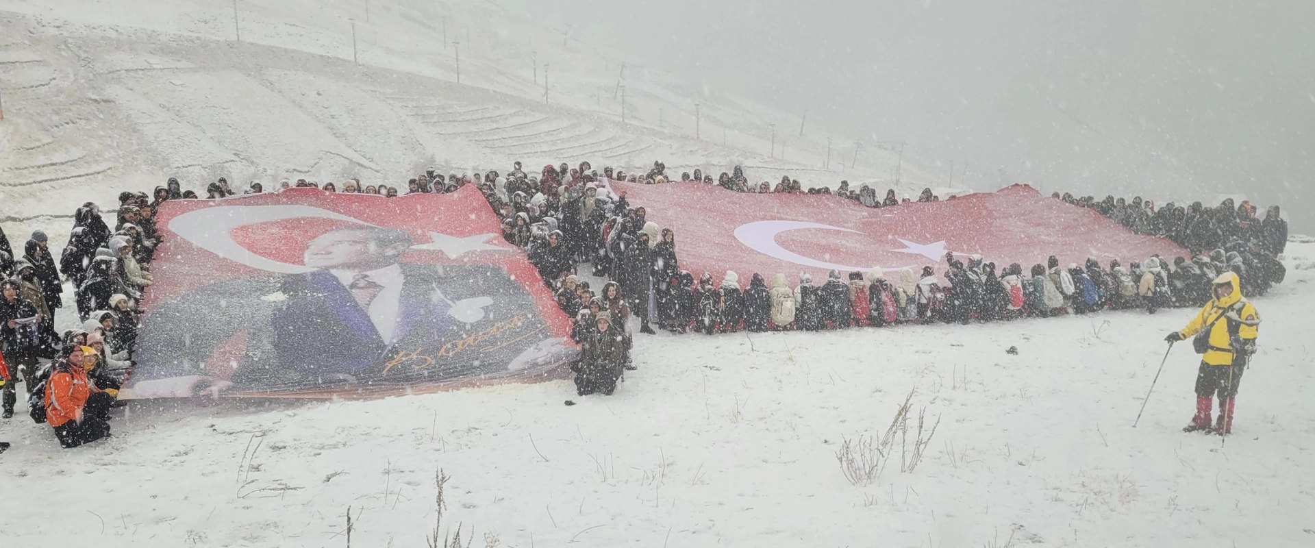 Salih TEKİN/ERZURUM, (DHA)- ERZURUM Atatürk Üniversitesi öğrencileri, 3 bin 176 metre yüksekliğindeki Palandöken Dağı'nın karlı zirvesine Cumhuriyet tırmanışı düzenledi. Zirve yürüyüşünde kar ve tipiye tutulan ekip, 2 bin 700 metrede Atatürk posteri ve Türk bayrağı açıp saygı duruşunda bulundu ve İstiklal Marşı'nı okudu.
