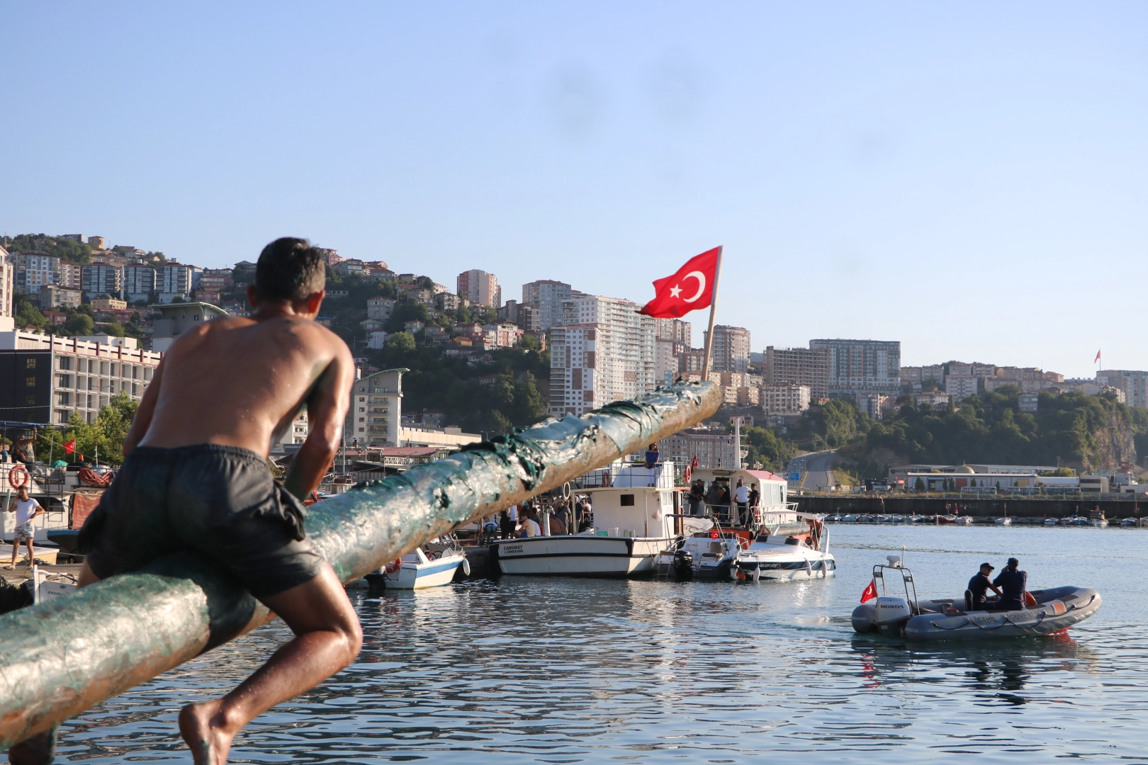 Ali Sencer ARSLAN/ ZONGULDAK, (DHA)- ZONGULDAK’ın Kozlu ilçesinde Denizcilik ve Kabotaj Bayramı etkinlikleri kapsamında düzenlenen yağlı direkten bayrak düşürme yarışı 1 saat boyunca devam etti. Yarışmaya katılan 6 kişi de bayrağı düşüremeyince 20 bin lira para ödülü sahibini bulamadı. Yağlı direkte şansını deneyenlere 2 bin lira katılım ödülü verildi.Kozlu Limanında, saat 16.00’da Denizcilik ve Kabotaj Bayramı kutlamaları kapsamında su sporları yarışmaları düzenlendi. Kayık, kürek çekme ve yüzme yarışlarının yanı sıra katılımcılar canlı ördeği Karadeniz’in serin sularında yakalamaya çalıştı. Ördeği kovalayan kalabalık komik görüntüler ortaya çıkardı. Geçen senenin yağlı direk şampiyonu Erhan Çengelcik, ördeği yakalayan kişi oldu. ULUSLARARASI HALK OYUNLARI OYNANDIYöresel halk oyunlarının yanı sıra, Meksika ve Bulgaristan ekipleri de kendi gösterilerini sergiledi. Halk oyunları gösterileri vatandaşlardan alkış aldı. KATILIMCILARA 2 BİN LİRA ÖDÜL Kutlamaların son etkinliği olarak 20 bin lira para ödüllü yağlı direkten bayrak düşürme yarışı düzenlendi. Koşarak yağlı direkte ilerlemeye çalışan 6 kişi 45 dakika boyunca uğraşsa da bayrağı düşürmeyi başaramadı. Hakem komitesi kararıyla sürünme ve sarılmayı da içeren serbest stilde bayrağa ulaşmaya çalışan katılımcılar bunda da başarılı olamayınca komite oyunu durdurma kararı verdi. Kimse bayrağı düşürerek ödüle sahip olamadı. Daha sonra tüm katılımcılara 2 bin lira para ödülü verildi. Yağlı direk yarışına vatandaşların ilgisinin yoğun olduğu görüldü. (DHA)