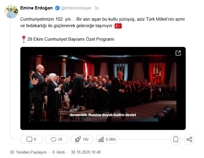 ANKARA, (DHA)- Cumhurbaşkanı Recep Tayyip Erdoğan'ın eşi Emine Erdoğan, dün Cumhurbaşkanlığı Külliyesi Sergi Salonu'nda düzenlenen 29 Ekim Cumhuriyet Bayramı Özel Programı'na ilişkin paylaşımda bulundu.
