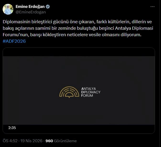 Emine Erdoğan, sanal medya hesabından yaptığı paylaşımda, "Diplomasinin birleştirici gücünü öne çıkaran, farklı kültürlerin, dillerin ve bakış açılarının samimi bir zeminde buluştuğu beşinci Antalya Diplomasi Forumu’nun, barışı kökleştiren neticelere vesile olmasını diliyorum" ifadelerine yer verdi. (DHA)