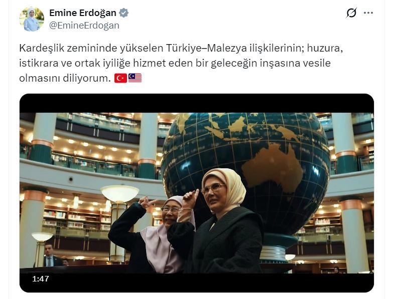 Emine Erdoğan, sanal medya hesabından yaptığı paylaşımda, "Kardeşlik zemininde yükselen Türkiye-Malezya ilişkilerinin huzura, istikrara ve ortak iyiliğe hizmet eden bir geleceğin inşasına vesile olmasını diliyorum" dedi. Paylaşımdaki videoda, Emine Erdoğan ile Wan Azizah İsmail'in Cumhurbaşkanlığı Millet Kütüphanesi ve Yaşayan Miras Okulu'nu ziyaretlerinden görüntüler yer aldı. (DHA)