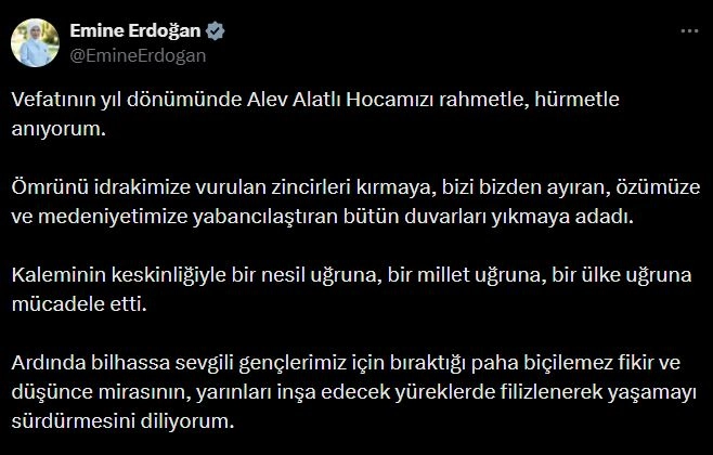 Emine Erdoğan, sanal medya hesabından yaptığı paylaşımda, "Vefatının yıl dönümünde Alev Alatlı Hocamızı rahmetle, hürmetle anıyorum. Ömrünü idrakimize vurulan zincirleri kırmaya, bizi bizden ayıran, özümüze ve medeniyetimize yabancılaştıran bütün duvarları yıkmaya adadı. Kaleminin keskinliğiyle bir nesil uğruna, bir millet uğruna, bir ülke uğruna mücadele etti. Ardında bilhassa sevgili gençlerimiz için bıraktığı paha biçilemez fikir ve düşünce mirasının, yarınları inşa edecek yüreklerde filizlenerek yaşamayı sürdürmesini diliyorum" dedi. (DHA)