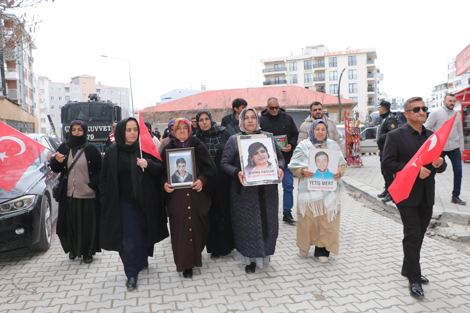 Terör örgütü PKK tarafından çocukları kaçırılan aileler, Menekşe Sokak’ta bir araya geldi. Ellerinde Türk bayrakları ve çocuklarının fotoğraflarını taşıyan aileler, slogan atmadan DEM Parti İl Binası’na kadar yürüdü. 119'uncu haftada süren yürüyüş sırasında polis ekipleri geniş güvenlik önlemi alırken, parti binasından da müzik açılmadı.