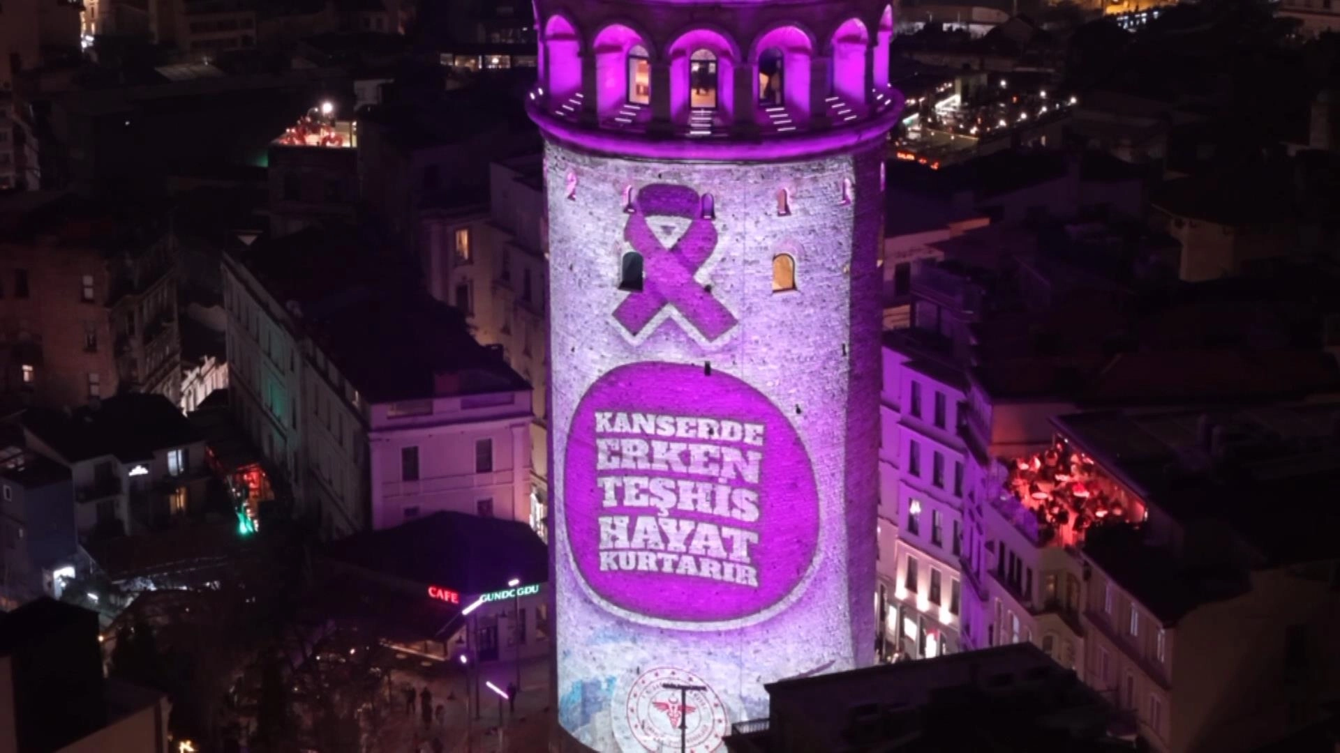 İstanbul İl Sağlık Müdürlüğü tarafından 'Kanserde erken teşhis hayat kurtarır' temasıyla farkındalık oluşturmak için, İstanbul'un simge yapısı Galata Kulesi'ne mor ışık yansıtıldı. Mor renge bürünen Galata Kulesi havadan görüntülendi. (DHA)
