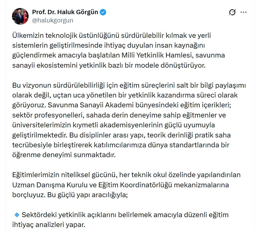 Savunma Sanayi Başkanı Görgün, sanal medya hesabından yaptığı açıklamada, "Ülkemizin teknolojik üstünlüğünü sürdürülebilir kılmak ve yerli sistemlerin geliştirilmesinde ihtiyaç duyulan insan kaynağını güçlendirmek amacıyla başlatılan Milli Yetkinlik Hamlesi, savunma sanayi ekosistemini yetkinlik bazlı bir modele dönüştürüyor. Bu vizyonun sürdürülebilirliği için eğitim süreçlerini salt bir bilgi paylaşımı olarak değil, uçtan uca yönetilen bir yetkinlik kazandırma süreci olarak görüyoruz. Savunma Sanayii Akademi bünyesindeki eğitim içerikleri; sektör profesyonelleri, sahada derin deneyime sahip eğitmenler ve üniversitelerimizin kıymetli akademisyenlerinin güçlü uyumuyla geliştirilmektedir. Bu disiplinler arası yapı, teorik derinliği pratik saha tecrübesiyle birleştirerek katılımcılarımıza dünya standartlarında bir öğrenme deneyimi sunmaktadır" dedi.