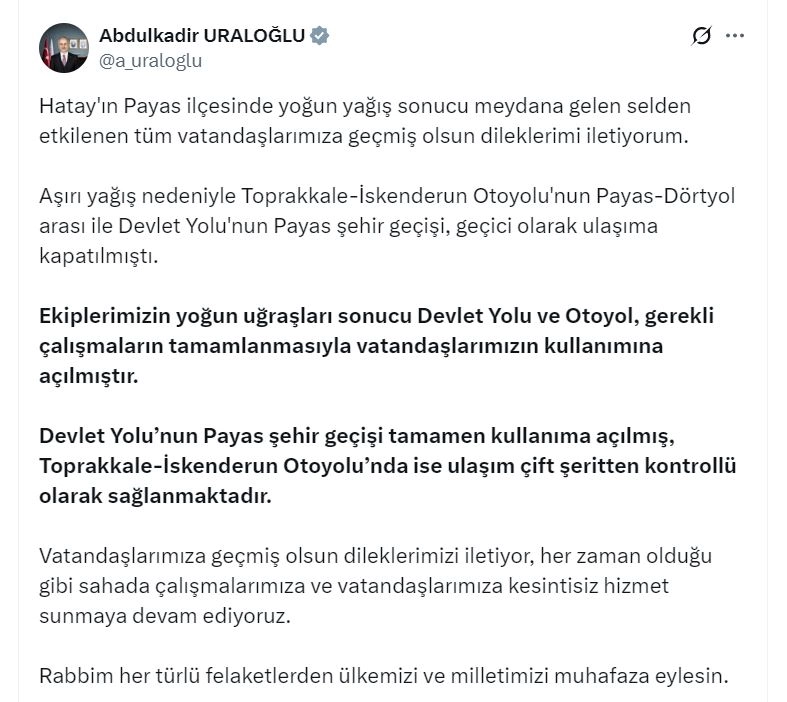 Ulaştırma ve Altyapı Bakanı Abdulkadir Uraloğlu, Hatay'ın Payas ilçesinde yoğun yağış sonucu meydana gelen selden etkilenenlere geçmiş olsun dileklerini ileterek, "Aşırı yağış nedeniyle Toprakkale-İskenderun Otoyolu'nun Payas-Dörtyol arası ile Devlet Yolu'nun Payas şehir geçişi, geçici olarak ulaşıma kapatılmıştı. Ekiplerimizin yoğun uğraşları sonucu Devlet Yolu ve Otoyol, gerekli çalışmaların tamamlanmasıyla vatandaşlarımızın kullanımına açılmıştır. Devlet Yolu'nun Payas şehir geçişi tamamen kullanıma açılmış, Toprakkale-İskenderun Otoyolu'nda ise ulaşım çift şeritten kontrollü olarak sağlanmaktadır. Vatandaşlarımıza geçmiş olsun dileklerimizi iletiyor, her zaman olduğu gibi sahada çalışmalarımıza ve vatandaşlarımıza kesintisiz hizmet sunmaya devam ediyoruz. Rabb'im her türlü felaketlerden ülkemizi ve milletimizi muhafaza eylesin" dedi. (DHA)