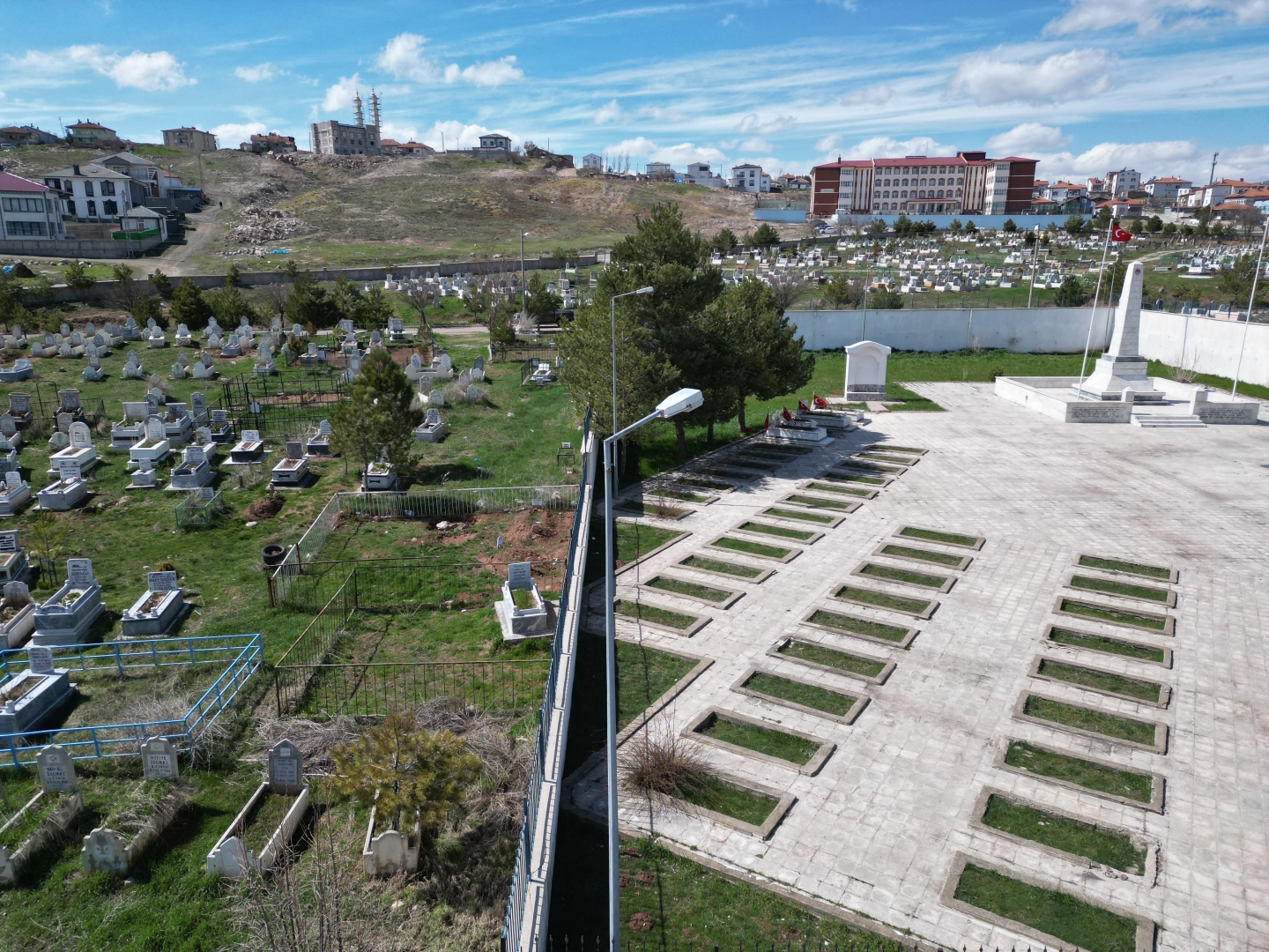 İlçe merkezindeki Yıldırım Mezarlığı'nda bazı mezarların kıble yönünün birbirinden farklı oluşu dikkat çekiyor. Mezarlık içerisinde bulunan Garnizon Şehitliği'ndeki kabirler ile sivil mezarlıkların kıble yönleri farklılık arz ediyor. Pusula ile yapılan kontrollerde Garnizon Şehitliği'ndeki mezar yerlerinin kıbleye uygun düzenlendiği dikkat çekerken, hemen yanındaki sivil mezarların yönlerinin değişiklik gösterdiği görüldü. Kıble yönlerinin özellikle şehitlikten farklı olduğu gözlenen mezarlar, dronla havadan görüntülendi.