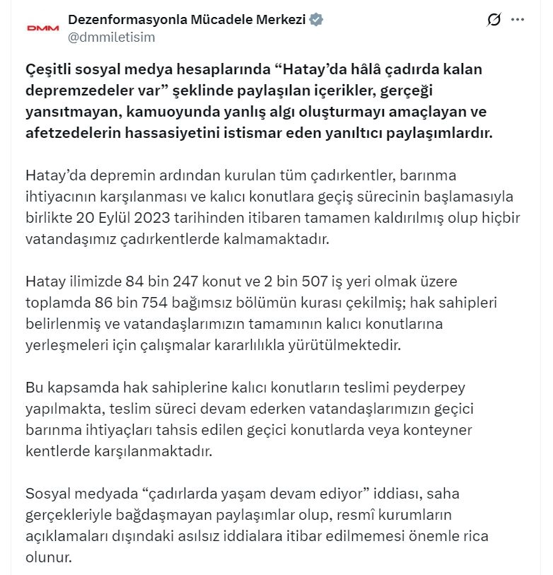 ANKARA, (DHA)- İLETİŞİM Başkanlığı Dezenformasyonla Mücadele Merkezi (DMM), 'Hatay'da hala çadırda kalan depremzedeler var' şeklindeki sosyal medya paylaşımlarına ilişkin, "Hatay'da depremin ardından kurulan tüm çadır kentler, barınma ihtiyacının karşılanması ve kalıcı konutlara geçiş sürecinin başlamasıyla birlikte 20 Eylül 2023 tarihinden itibaren tamamen kaldırılmış olup hiçbir vatandaşımız çadır kentlerde kalmamaktadır" açıklamasını yaptı.DMM'nin sosyal medya hesabından yapılan açıklamada, "Çeşitli sosyal medya hesaplarında 'Hatay'da hala çadırda kalan depremzedeler var' şeklinde paylaşılan içerikler, gerçeği yansıtmayan, kamuoyunda yanlış algı oluşturmayı amaçlayan ve afetzedelerin hassasiyetini istismar eden yanıltıcı paylaşımlardır. Hatay'da depremin ardından kurulan tüm çadır kentler, barınma ihtiyacının karşılanması ve kalıcı konutlara geçiş sürecinin başlamasıyla birlikte 20 Eylül 2023 tarihinden itibaren tamamen kaldırılmış olup hiçbir vatandaşımız çadır kentlerde kalmamaktadır. Hatay ilimizde 84 bin 247 konut ve 2 bin 507 iş yeri olmak üzere toplamda 86 bin 754 bağımsız bölümün kurası çekilmiş; hak sahipleri belirlenmiş ve vatandaşlarımızın tamamının kalıcı konutlarına yerleşmeleri için çalışmalar kararlılıkla yürütülmektedir" denildi.'SAHA GERÇEKLERİYLE BAĞDAŞMAYAN PAYLAŞIMLAR' Açıklamada ayrıca, "Hak sahiplerine kalıcı konutların teslimi peyderpey yapılmakta, teslim süreci devam ederken vatandaşlarımızın geçici barınma ihtiyaçları tahsis edilen geçici konutlarda veya konteyner kentlerde karşılanmaktadır. Sosyal medyada 'çadırlarda yaşam devam ediyor' iddiası, saha gerçekleriyle bağdaşmayan paylaşımlar olup, resmi kurumların açıklamaları dışındaki asılsız iddialara itibar edilmemesi önemle rica olunur" ifadelerine yer verildi. (DHA)