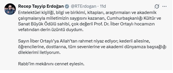 Cumhurbaşkanı Erdoğan sanal medya hesabından yaptığı açıklamasında, "Entelektüel kişiliği, bilgi ve birikimi, kitapları, araştırmaları ve akademik çalışmalarıyla milletimizin saygısını kazanan, Cumhurbaşkanlığı Kültür ve Sanat Büyük Ödülü sahibi, çok değerli Prof. Dr. İlber Ortaylı hocamızın vefatından derin üzüntü duydum. Sayın İlber Ortaylı’ya Allah’tan rahmet niyaz ediyor; kederli ailesine, öğrencilerine, dostlarına, tüm sevenlerine ve akademi dünyamıza başsağlığı dileklerimi iletiyorum. Rabb’im mekânını cennet eylesin." ifadelerine yer verdi. (DHA)