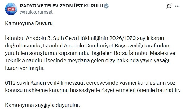 RTÜK'ün sanal medya hesabından yapılan açıklamada, "İstanbul Anadolu 3'üncü Sulh Ceza Hakimliğinin 2026/1970 sayılı kararı doğrultusunda, İstanbul Anadolu Cumhuriyet Başsavcılığı tarafından yürütülen soruşturma kapsamında, Taşdelen Borsa İstanbul Mesleki ve Teknik Anadolu Lisesi’nde meydana gelen olay hakkında yayın yasağı kararı verilmiştir. 6112 sayılı Kanun ve ilgili mevzuat çerçevesinde yayıncı kuruluşların söz konusu mahkeme kararına hassasiyetle riayet etmeleri önemle hatırlatılır" denildi. (DHA)