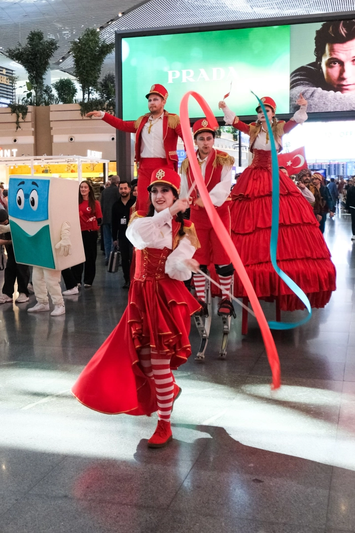 İbrahim YILDIZ/İSTANBUL, (DHA)- TÜRKİYE Cumhuriyeti’nin 102’nci kuruluş yıl dönümü İstanbul Havalimanı’nda coşkuyla kutlandı. Kutlamalar kapsamında yabancı konuklara Türk bayrağı hediye edilirken, müzik dinletileri ve folklor ekiplerinin gösterileri yolculardan yoğun ilgi gördü.