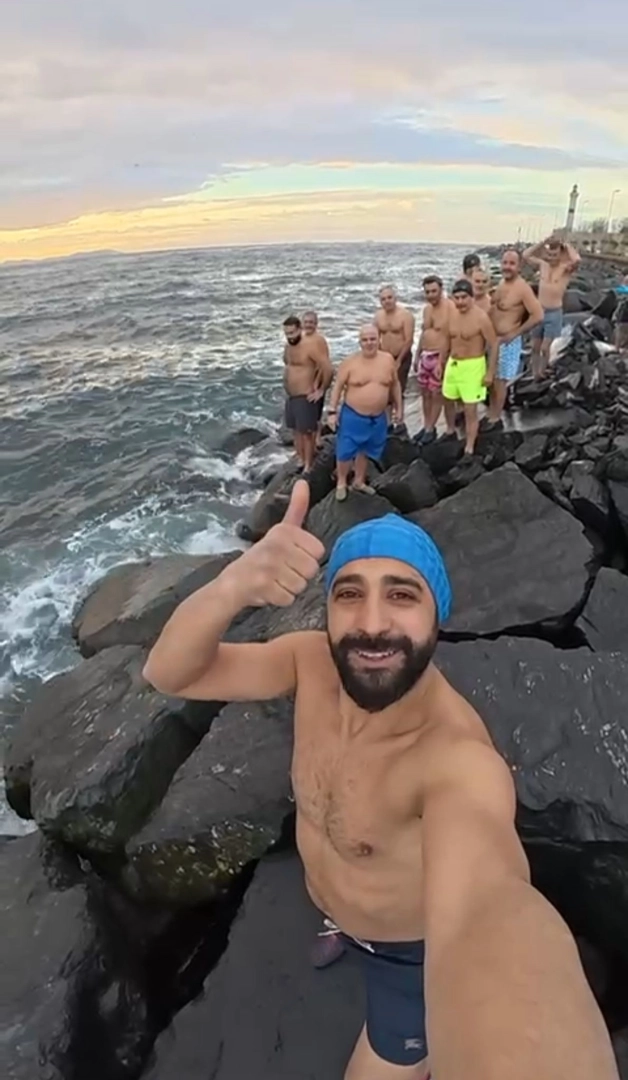 İSTANBUL (DHA) Kendilerine 'Sarayburnu Balinaları' adını veren yaklaşık 20 kişiden oluşan grup, lodosa rağmen denize girdi.