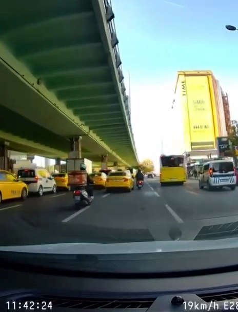 Şişli'de meydana gelen kazada, kontrolsüz şekilde şerit değiştiren taksi, aynı yönde seyreden motosiklete çarptı. Çarpmanın etkisiyle dengesini kaybeden motosiklet sürücüsü yola savruldu. Akşam saatlerinde ara sokaktan aniden dönüş yapan başka bir taksi nedeniyle frene basmak zorunda kalan motosikletli yere düştü. Ölen ya da yaralanın olmadığı kazalar, çevredeki araçların kameraları tarafından saniye saniye kaydedildi. Görüntülerde, taksi şoförlerinin kontrolsüz şerit değiştirmeleri ve dönüş yapmaları nedeniyle motosikletlilerin yaşadığı kazalar yer alıyor. (DHA)