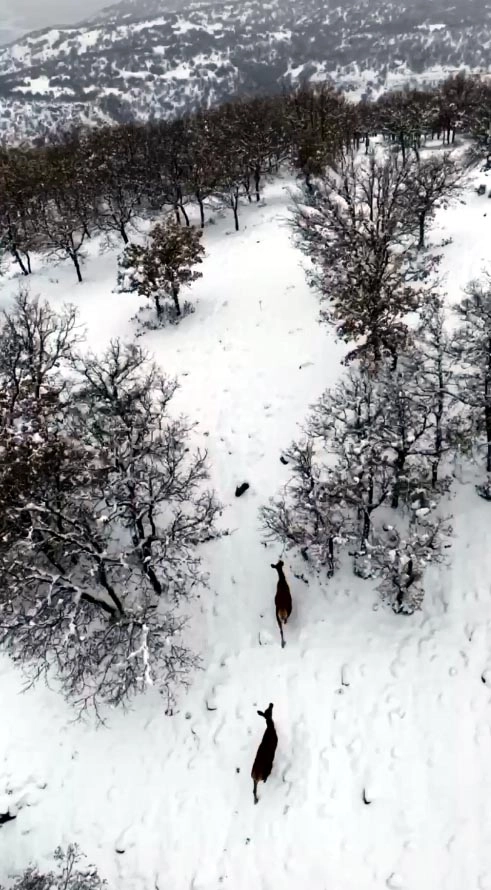 Mutlu YUCA/BOLU, (DHA)- BOLU'nun Seben ilçesinde karla kaplı ormanda gezen 2 karaca dron ile görüntülendi.