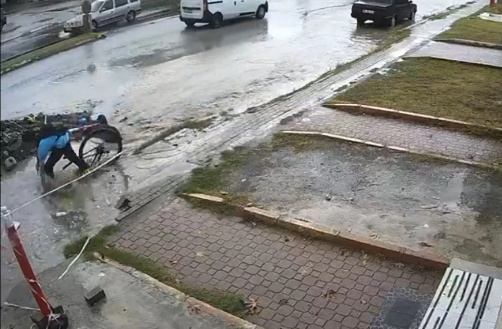 Sedat İSKENDEROĞLU (Hatay), (DHA)- HATAY'ın Dörtyol ilçesinde bir lise öğrencisi, yağışlı havada bisikletiyle yağmur suyu dolu 2 metre derinliğindeki çukura düştü. Çukurdan esnaf tarafından çıkarılan öğrencinin düşme anı güvenlik kamerasına yansıdı.Olay, saat 12.30 sıralarında Dörtyol ilçesi Şaban Akın Uçar Caddesi'nde meydana geldi. Henüz ismi öğrenilemeyen 14 yaşlarındaki lise öğrencisi, bisikletiyle kaldırımda ilerlerken, 20 gün önce açıldığı ileri sürülen yoldaki yağmur suyu dolu 2 metre derinliğindeki çukura düştü. Çocuğun yardımına çevredeki esnaf yetişti. Esnafın elinden tutup çukurdan çıkardığı öğrenci, tekrar bisikletine binerek bölgeden uzaklaştı. O anlar, bir iş yerinin güvenlik kamerasına yansıdı. (DHA)