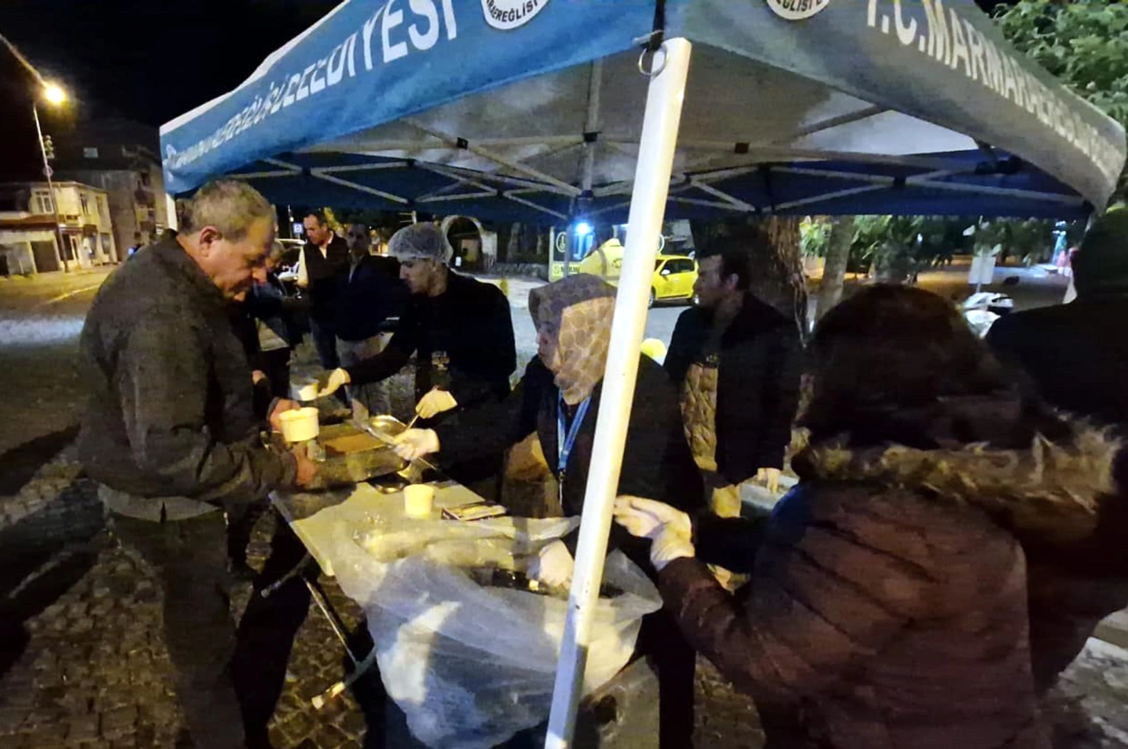 MARMARAEREĞLİSİ'NDE ÇORBA DAĞITILDITekirdağ'ın Marmaraereğlisi ilçesi açıklarında meydana gelen 5.0 büyüklüğündeki depremin ardından ilçede belediyesi tarafından vatandaşlar anonslarla uyarıldı. Anonslarda, "İlçemizde şu ana kadar olumsuz bir durum, can ve mal kaybı meydana gelmemiştir. Olası bir acil duruma veya artçı depreme karşı kapalı alanlarda bulunmamaya özen gösterelim" denildi.Akşam saatlerinde ise belediye tarafından vatandaşlara çorba ve deprem ilk yardım seti dağıtıldı. Marmaraereğlisi Belediye Başkanı Mustafa Onur Bozkurter, çorba dağıtımına katılarak vatandaşlara geçmiş olsun dileğinde bulundu. Bozkurter, "Hepimize geçmiş olsun, sahada ekiplerimiz tarama çalışmalarını tamamladılar. Şu an için herhangi bir sorunumuz yok. Belediye olarak 24 saat ekiplerimiz görev başındalar. Vatandaşlarımızın da uyarıları dikkate almalarını temenni ediyorum" dedi. Şafak TAŞOYAR/ MARMARAEREĞLİSİ (Tekirdağ), (DHA)