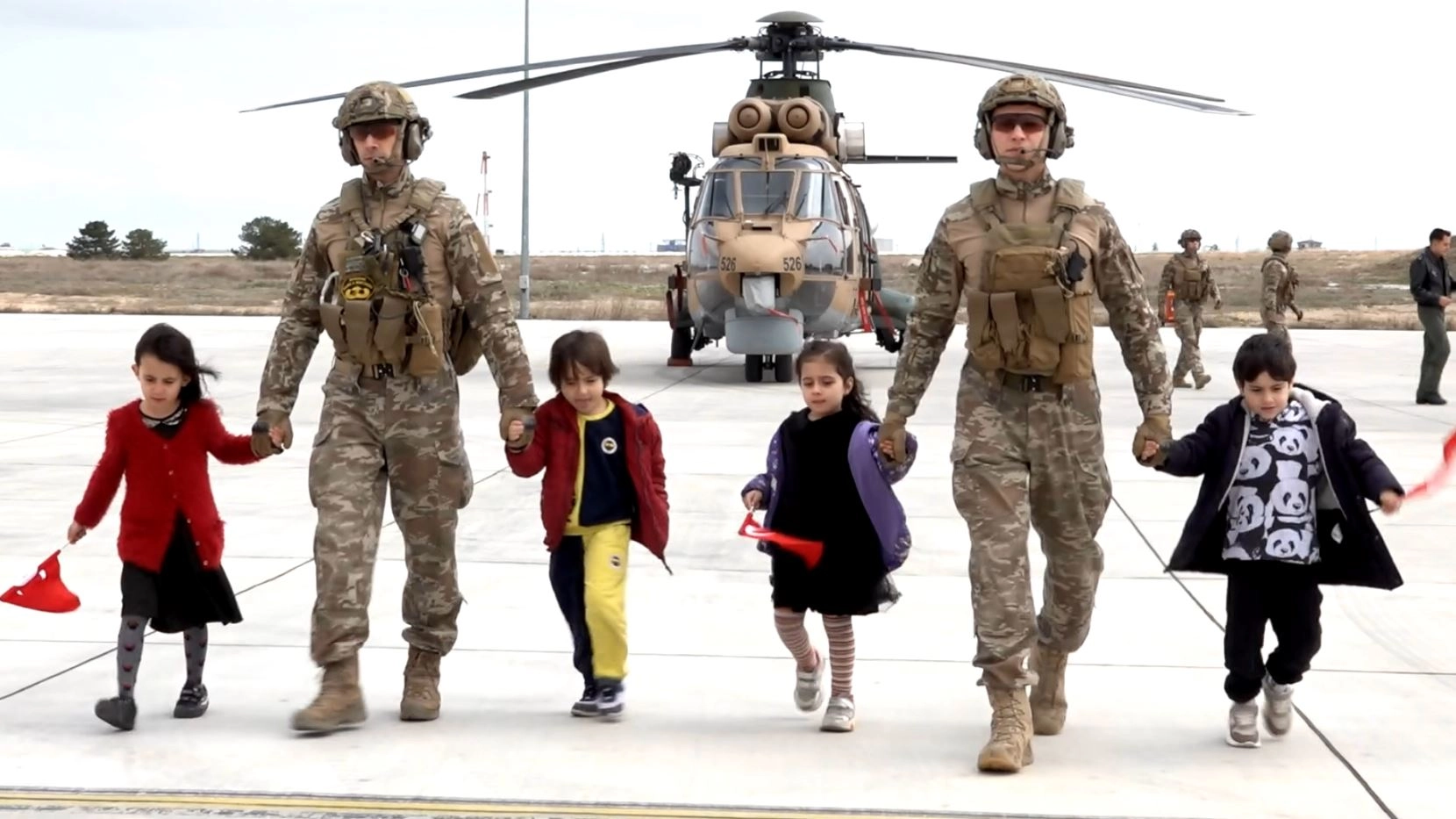 Klipte ise şarkıcı Şenay'ın seslendirdiği 'Hayat Bayram Olsa' şarkısıyla beraber, Mehmetçik ile bir araya gelen çocukların askeri araçlara binerken görüntüleri yer aldı. (DHA)