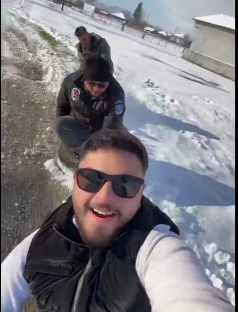 Musa KESKİN/ DÜZCE, (DHA)- DÜZCE’de, etkili olan kar yağışının ardından kent beyaz örtüyle kaplanırken, vatandaşlar yağan karın keyfini çıkararak eğlenceye çevirdi. Bir kişi ise otomobile bağladığı koltuklar kar üzerinde seyahat etti.
