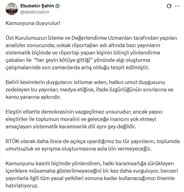 RTÜK Başkanı Ebubekir Şahin, sosyal medya hesabından yaptığı açıklamada, "Üst Kurulumuzun izleme ve değerlendirme uzmanları tarafından yapılan analizler sonucunda; 'sokak röportajları' adı altında bazı yayınların sistematik biçimde ve röportajı yapan kişinin bilinçli yönlendirme çabaları ile her şeyin kötüye gittiği yönünde algı oluşturma çalışmalarında son zamanlarda artış olduğu tespit edilmiştir. Belirli kesimlerin duygularını istismar eden, halkın umut duygusunu zedeleyen bu yayınlar; medya etiğine, ifade özgürlüğünün sınırlarına ve kamu yararına aykırıdır. Eleştiri elbette demokrasinin vazgeçilmez unsurudur; ancak yapıcı eleştiriler ile toplumun moralini ve geleceğe inancını yok etmeyi amaçlayan sistematik karamsarlık dili aynı şey değildir. RTÜK olarak daha önce de açıkça uyardığımız bu tür yayınların, toplumda umutsuzluk ve ayrışma oluşturmasına asla izin vermeyeceğiz. Kamuoyunu kasıtlı biçimde yönlendiren, halkı karamsarlığa sürükleyen içeriklere müsamaha gösterilmeyeceğini bir kez daha vurguluyor, benzeri yayınlarla ilgili tüm yasal yetkileri sonuna kadar kullanacağımızı önemle hatırlatıyoruz" ifadelerini kullandı. (DHA)