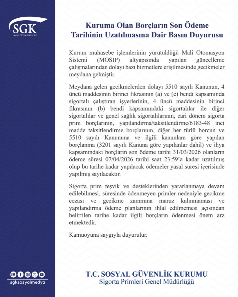 SGK tarafından yapılan yazılı açıklamada, “Kurum muhasebe işlemlerinin yürütüldüğü Mali Otomasyon Sistemi (MOSIP) altyapısında yapılan güncelleme çalışmalarından dolayı bazı hizmetlere erişilmesinde gecikmeler meydana gelmiştir. Meydana gelen gecikmelerden dolayı 5510 sayılı Kanunun, 4 üncü maddesinin birinci fıkrasının (a) ve (c) bendi kapsamında sigortalı çalıştıran işyerlerinin, 4 üncü maddesinin birinci fikrasının (b) bendi kapsamındaki sigortalılar ile diğer sigortalılar ve genel sağlık sigortalılarının, cari dönem sigorta prim borçlarının, yapılandırma/taksitlendirme/6183-48 inci madde taksitlendirme borçlarının, diğer her türlü borcun ve 5510 sayılı Kanununa ve ilgili kanunlara göre yapılan borçlanma (3201 sayılı Kanuna göre yapılanlar dahil) ve ihya kapsamındaki borçların son ödeme tarihi 31/03/2026 olanların ödeme süresi 07/04/2026 tarihi saat 23:59'a kadar uzatılmış olup bu tarihe kadar yapılacak ödemeler yasal süresi içerisinde yapılmış sayılacaktır. Sigorta prim teşvik ve desteklerinden yararlanmaya devam edilebilmesi, süresinde ödenmeyen primler nedeniyle gecikme cezası ve gecikme zammına maruz kalınmaması ve yapılandırma ödeme planlarının ihlal edilmemesi açısından belirtilen tarihe kadar ilgili borçların ödenmesi önem arz etmektedir” denildi. (DHA)